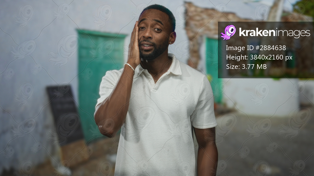 Man with hands to temples on old town street pressing his temples and wincing in visible pain and discomfort for headache; stress.