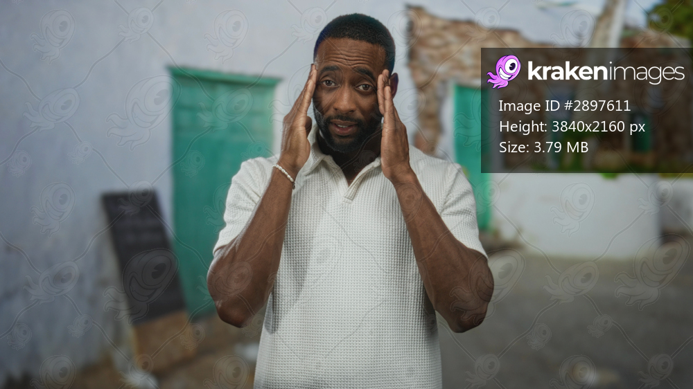 Man with hands to temples on old town street pressing his temples and wincing in visible pain and discomfort for headache; stress.