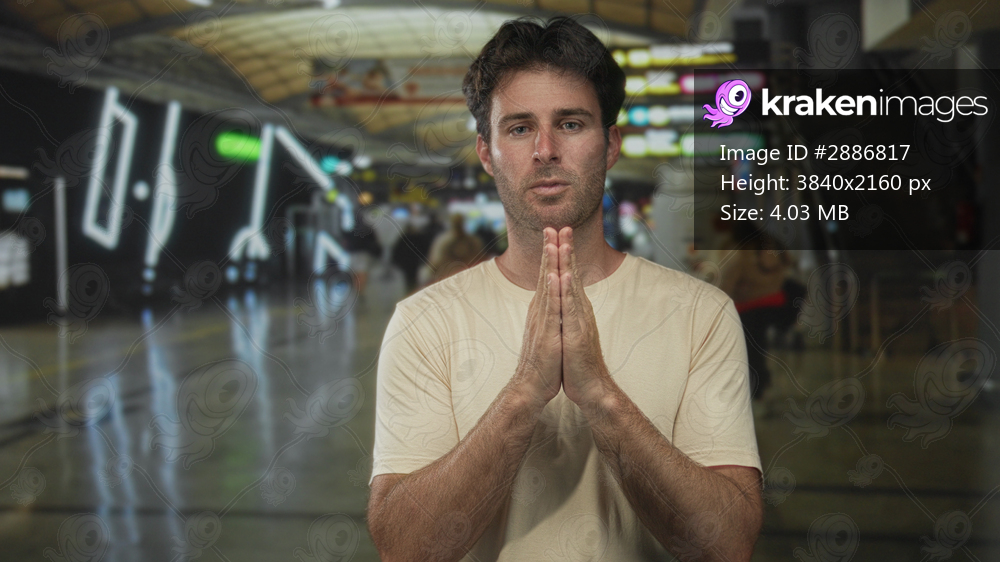 Man with hands together in airport terminal near illuminated departure boards, wearing beige t shirt and standing frontlit; calm reflection.