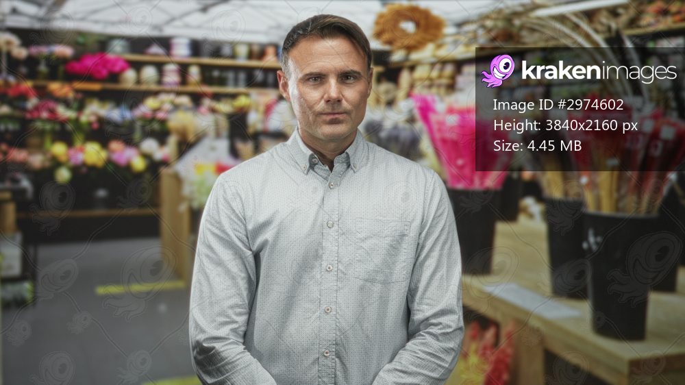 Man handsome hispanic with hands clasped standing by buckets of flowers and wrapped bouquets in a florist shop inside a building, facing camera; calm reflection. - Kraken Images