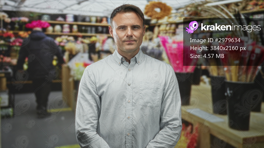 Man handsome hispanic with hands clasped standing by buckets of flowers and wrapped bouquets in a florist shop inside a building, facing camera; calm reflection. - Kraken Images