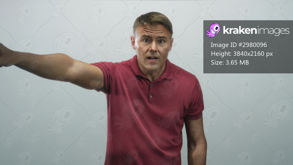 Man, handsome hispanic, pointing arm extended with finger out while wearing red polo shirt against plain studio grey backdrop; concern urgency alert.