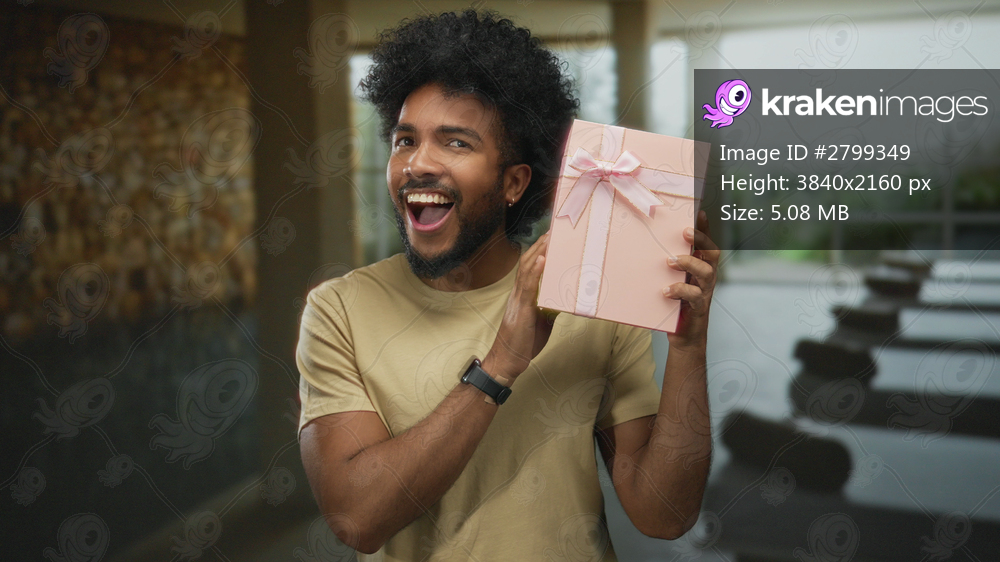 Man happily holding a pink gift box indoors at a resort pool area, expressing joy and surprise with lush greenery visible through large windows.
