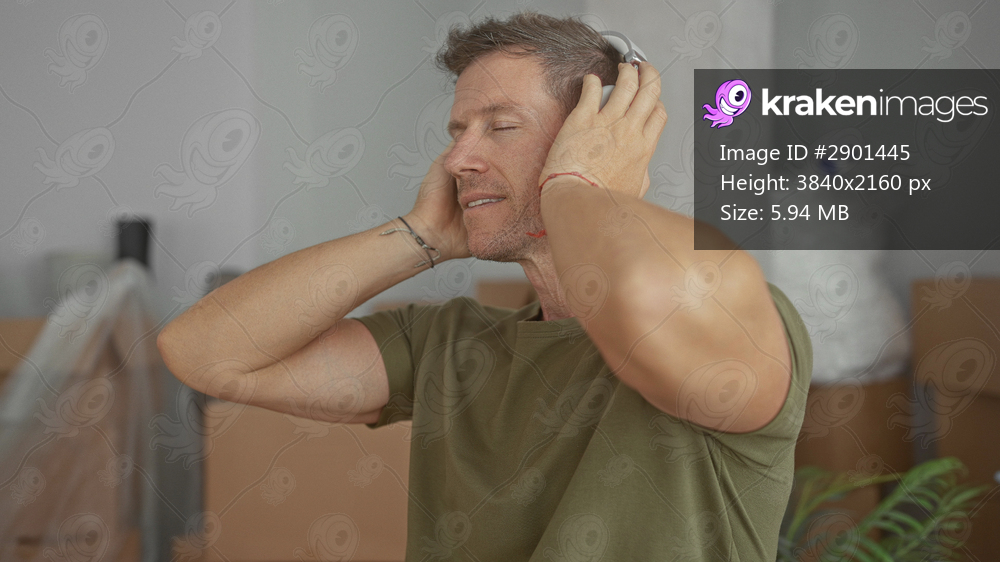 Man with headphones and hands on ears, eyes closed and smiling in building surrounded by moving boxes and plant; relaxation comfort.