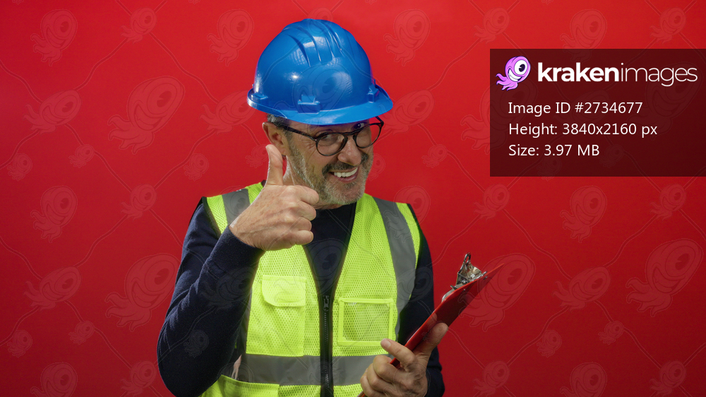 Man with helmet and vest holds clipboard against red background showing determination and confidence in construction industry