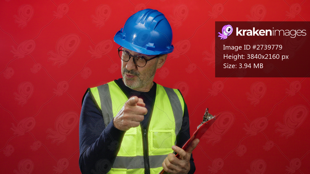 Man with helmet and vest holds clipboard against red background showing determination and confidence in construction industry