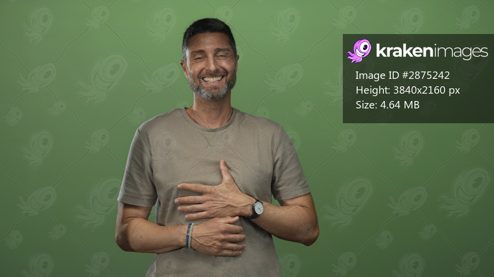 Man hispanic middle aged holding hand on stomach smiling and leaning slightly forward in studio with green backdrop; joy.