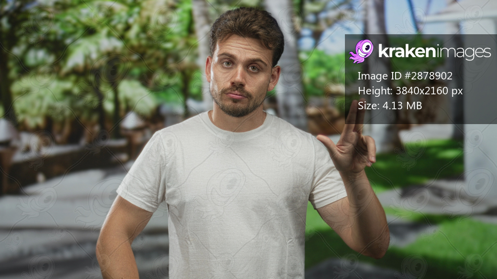 Man hispanic young in a white t shirt holds up two fingers near his face in a forest with green trees and grass; skepticism.