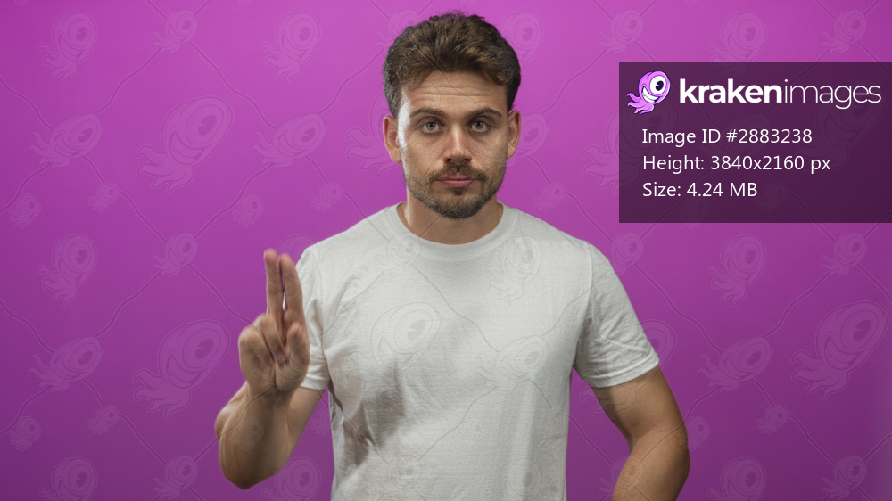 Man hispanic young in white t shirt with beard holding two fingers to temple and raising right hand gesture in magenta studio; skepticism introspection. - Kraken Images