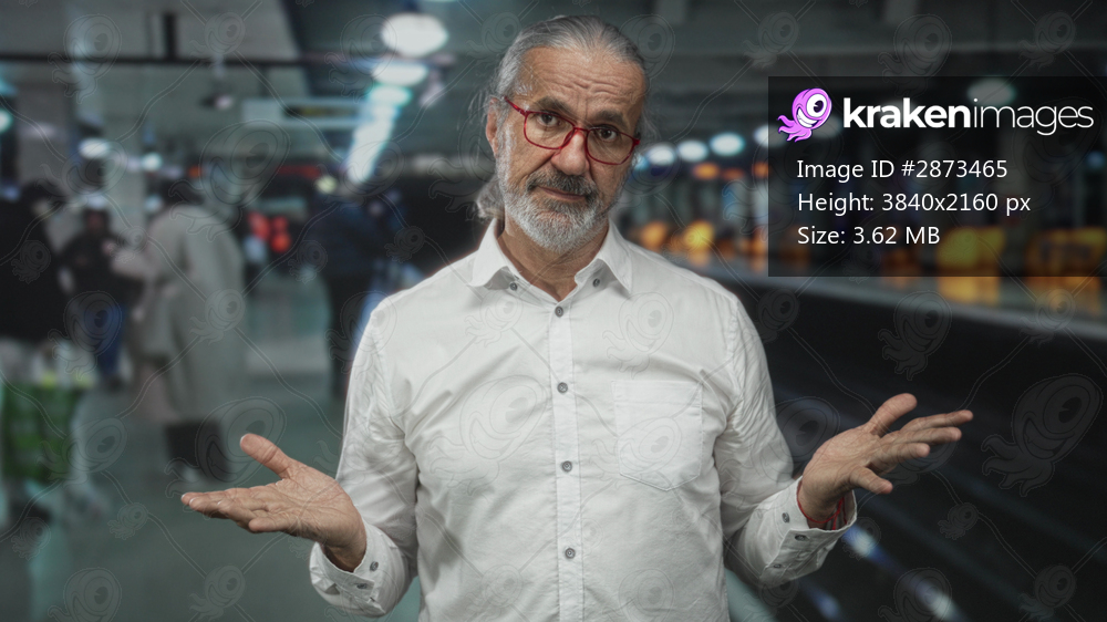 Man with hoary long hair and beard holding palms out with hands raised in a busy railway station building; personal space concern.