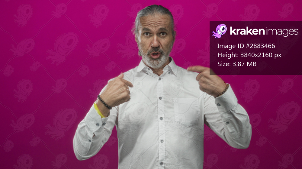 Man with hoary long hair and beard in white shirt points both index fingers upward in magenta studio; confidence empowerment.