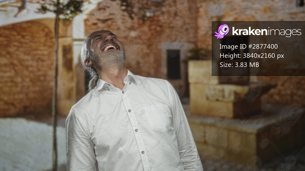 Man with hoary long hair and beard laughing with head tilted back, face visible on old town street; joy contentment wisdom.