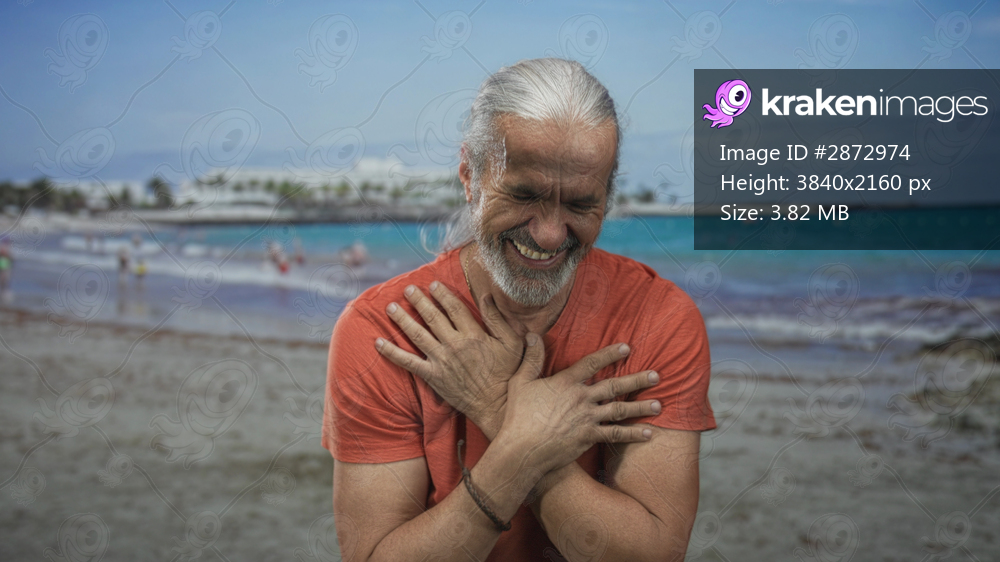 Man with hoary long hair and beard pointing finger with bare hands toward camera on studio beach set; cheerful relaxation.