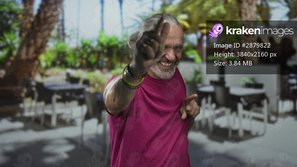 Man with hoary long hair and beard points finger at camera on street cafe terrace outdoors, wearing pink shirt and bracelets while smiling; playful charm. - Kraken Images