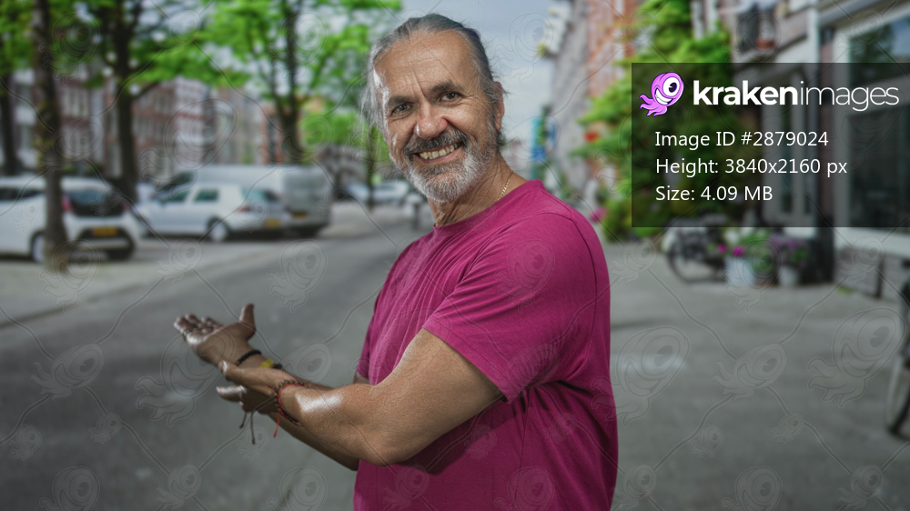 Man with hoary long hair claps hands on a city street wearing a magenta shirt; joy welcome warmth community.
