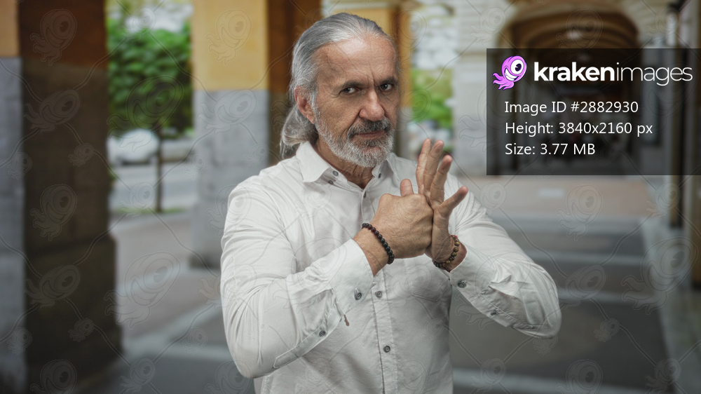 Man with hoary long hair clenching a fist and holding an open palm in building arcade, staring forward; anger defiance.