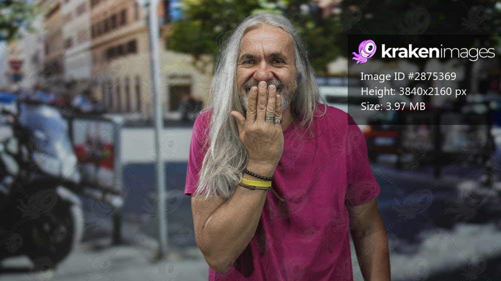 Man with hoary long hair covers mouth with hand on a city street wearing magenta t shirt and bracelets; playful surprise.