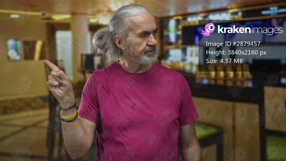 Man with hoary long hair points finger inside a casual restaurant building, wrist bracelets visible and head turned to the side; skepticism caution warning. - Kraken Images