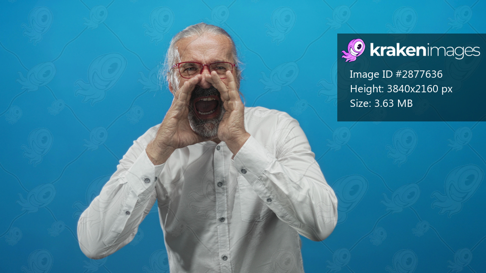 Man with hoary long hair and red glasses cupping hand to mouth shouting in blue studio wearing white shirt; urgency communication.