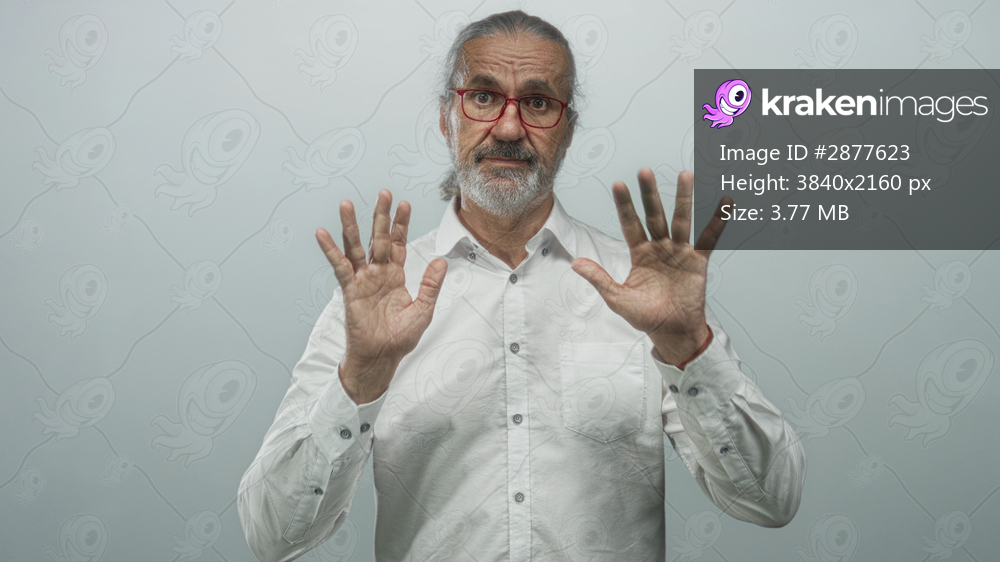 Man with hoary long hair showing hands raised palms out in a studio with a pale gray backdrop; caution safety warning restraint.