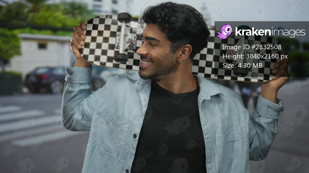 Man holding a black and white checkered skateboard behind his head on a busy urban street with a broad smile; freedom.