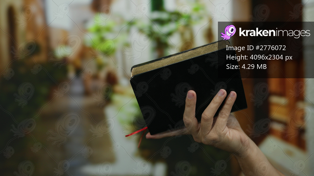 Man holding a book on a sunny street, showcasing the serene atmosphere of a town with blurred green plants.