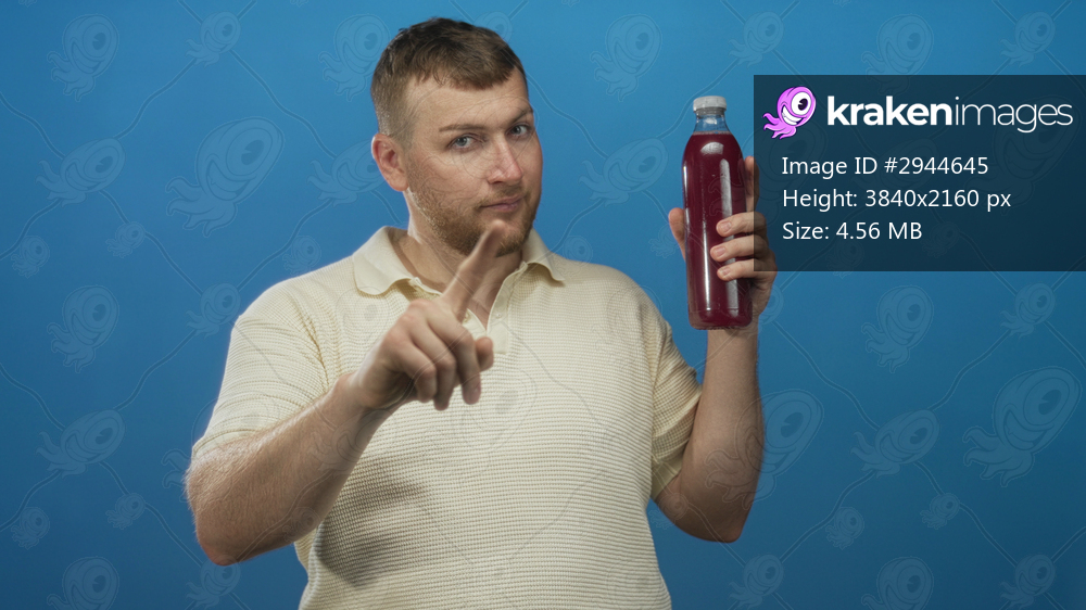 Man holding a bottle and pointing finger in blue studio; confident pitch for healthy drink promotion.