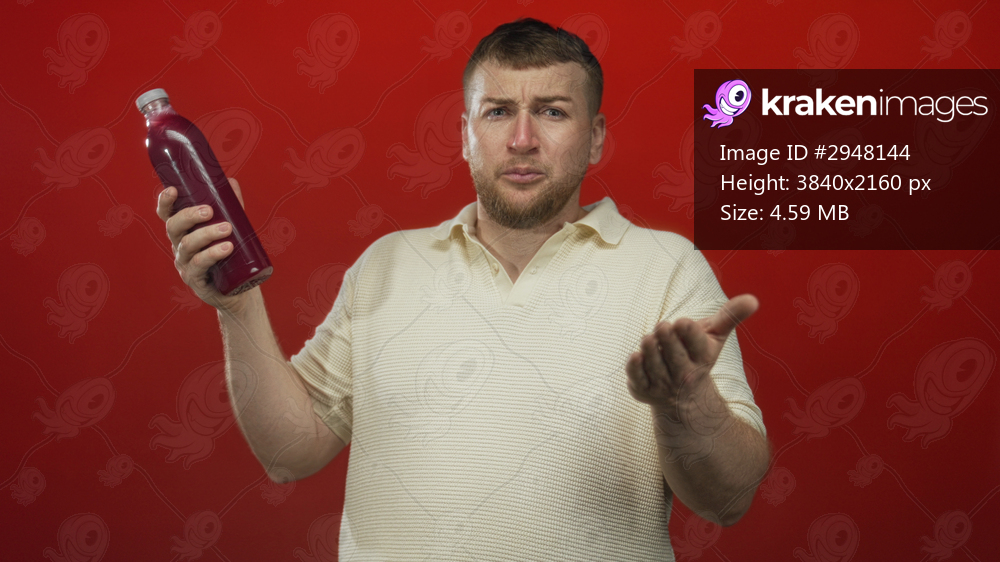 Man holding a bottle with right hand and open palm gesture in studio with red set; confusion doubt question.