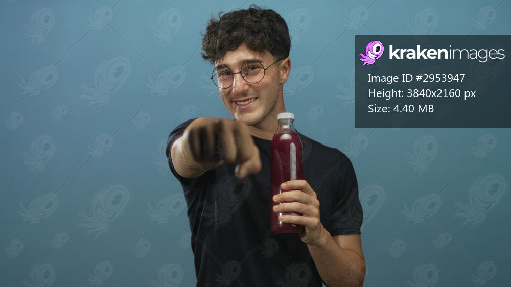 Man holding a bottled drink and pointing with hand toward camera against blue studio backdrop, wearing glasses and a black shirt; confidence.