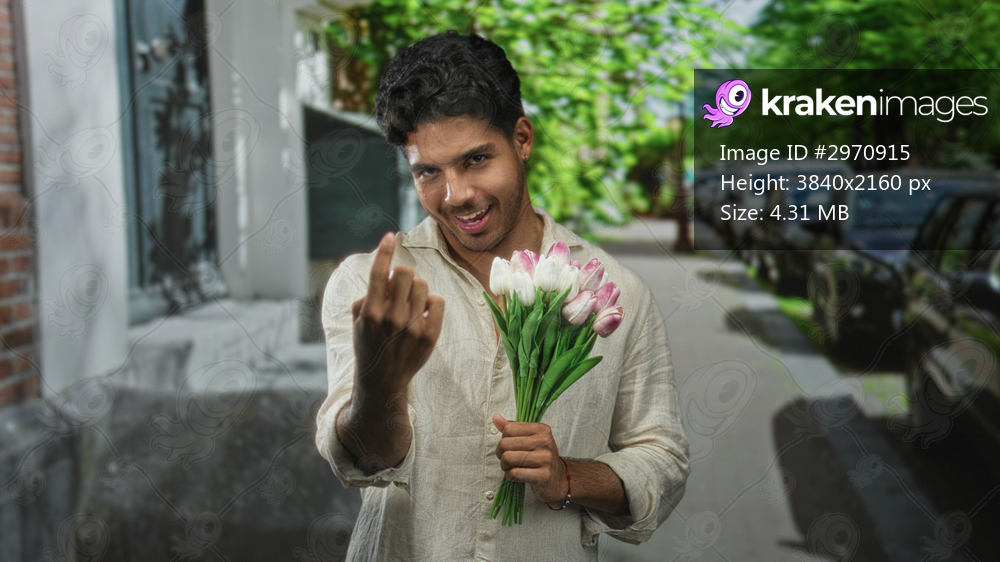 Man holding a bouquet of pink tulips beckons with finger on a tree lined street beside parked cars, offering flowers and a shy smile; romance longing.