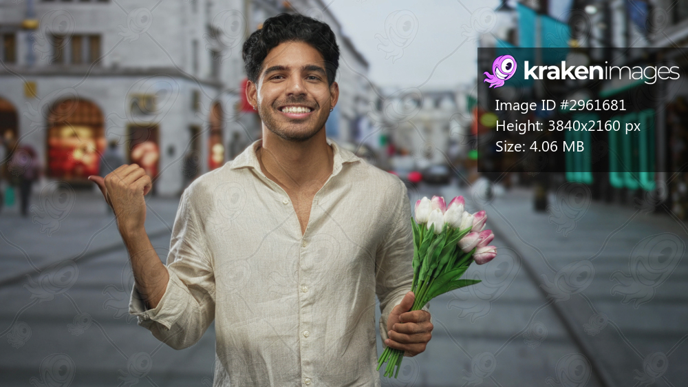 Man holding a bouquet of tulips on a pedestrian shopping street, smiling with eyes closed and wearing a beige linen shirt while gently gripping stems; romance joy. - Kraken Images