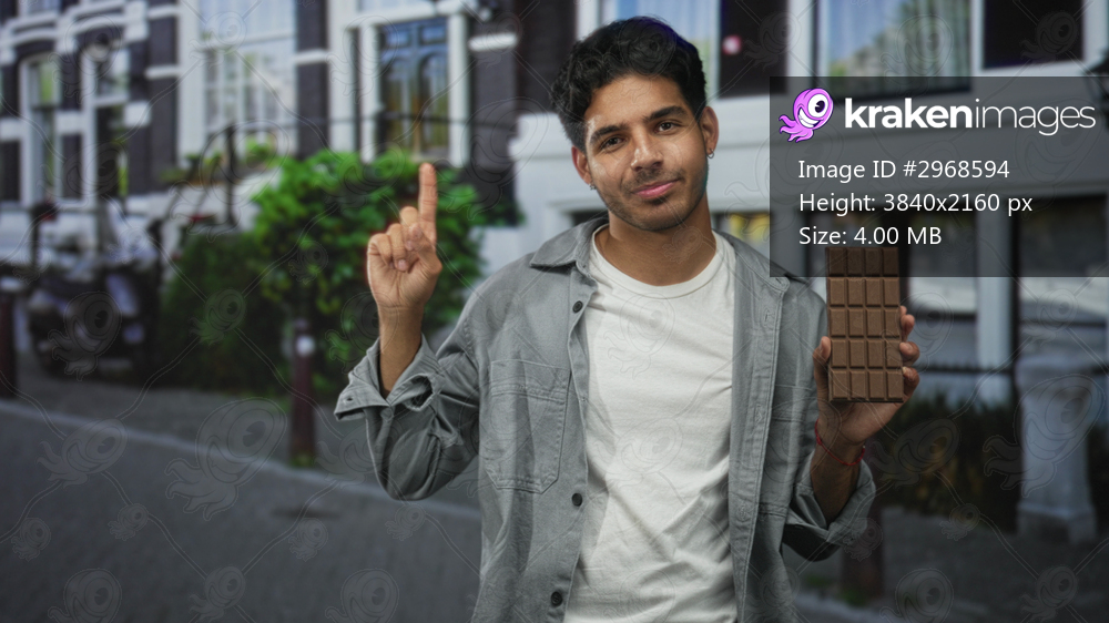 Man holding a chocolate bar in one hand, points finger and smiles on a cobbled street with row houses and parked scooters; joyful play.