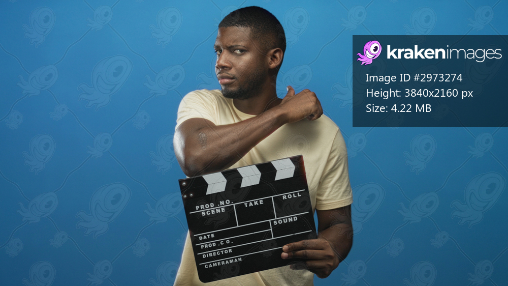 Man holding a clapperboard and pointing finger at camera while wearing beige tee against blue studio wall; confidence clarity determination.