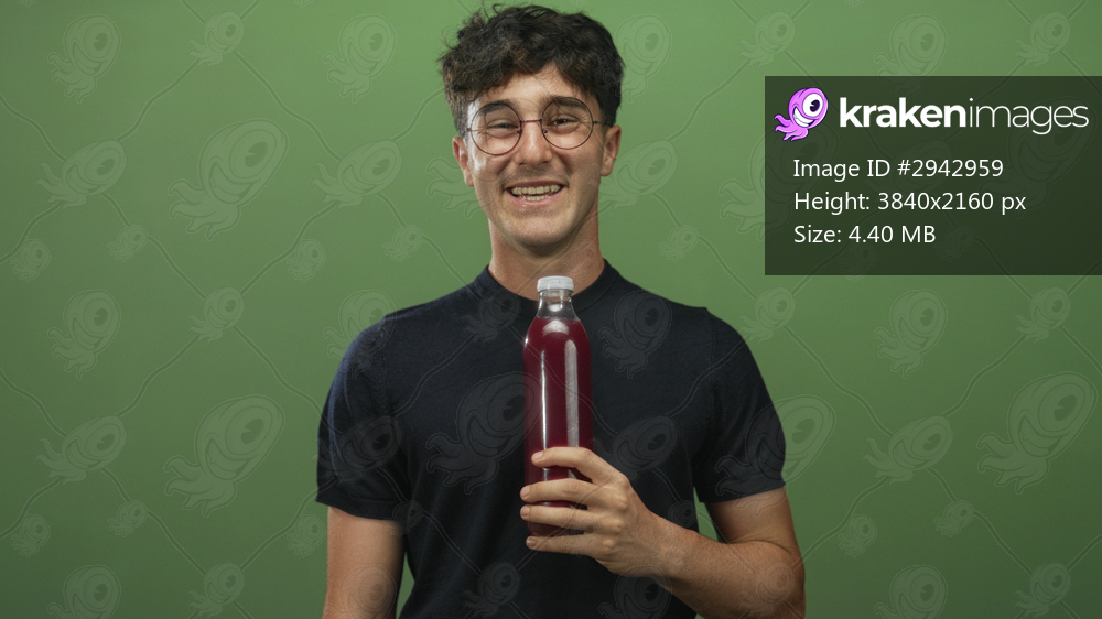 Man holding a clear bottle of purple juice and shrugging while wearing glasses in a green studio; taste uncertainty.