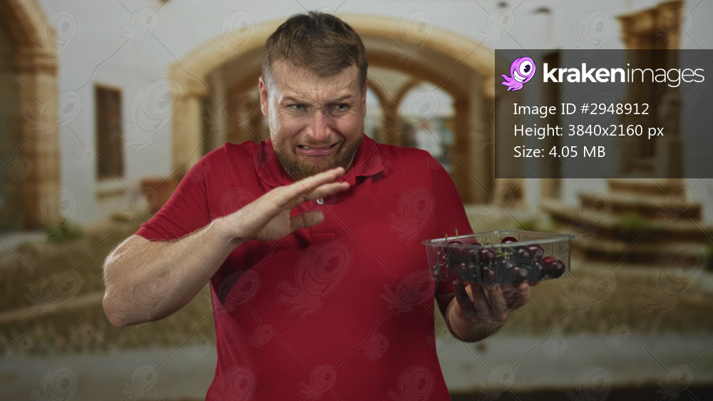Man holding a clear container of cherries pinching his nose on an old town street from a strong odor while grimacing; disgust smell revulsion.