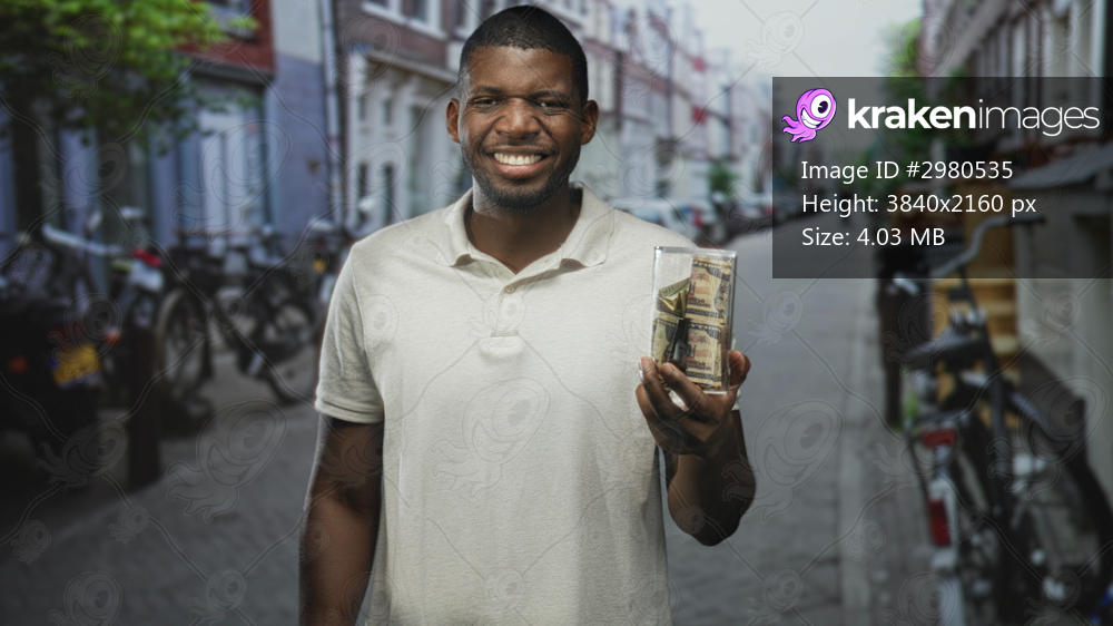 Man holding a clear jar of us dollar bills on a street, smiling and showing cash in hand; hopeful savings.