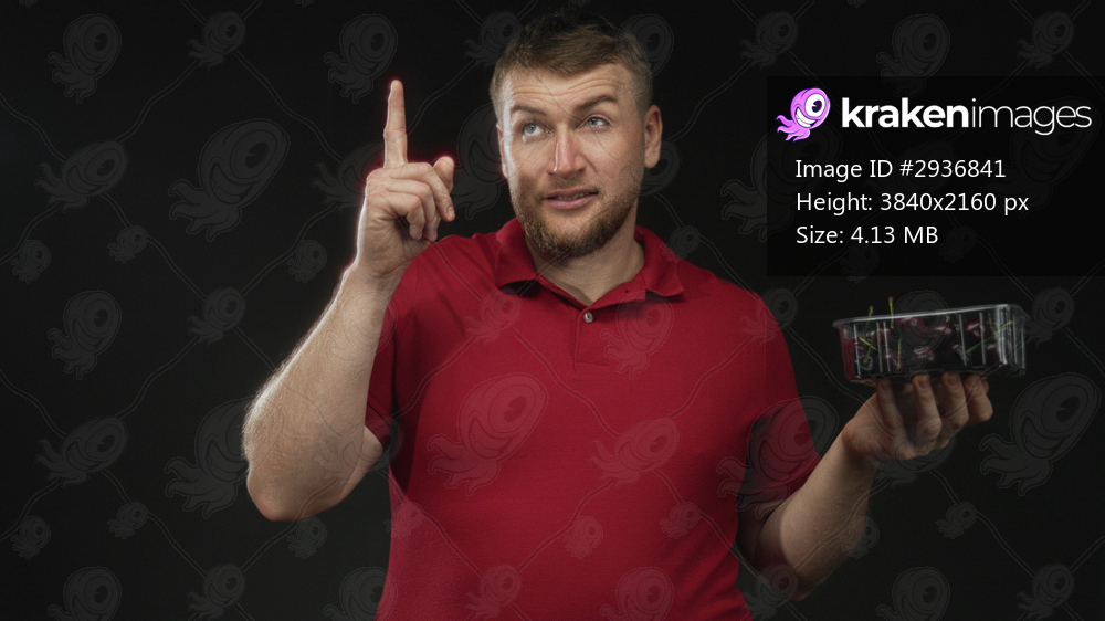 Man holding a clear punnet of cherries with right hand and pointing finger up in studio with black background; surprise.