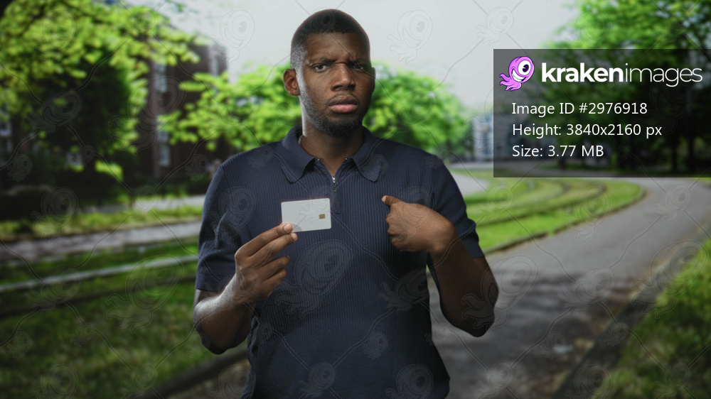 Man holding a credit card in left hand and points finger to card near his chest on a tree lined urban street with tram tracks; doubt identity security. - Kraken Images