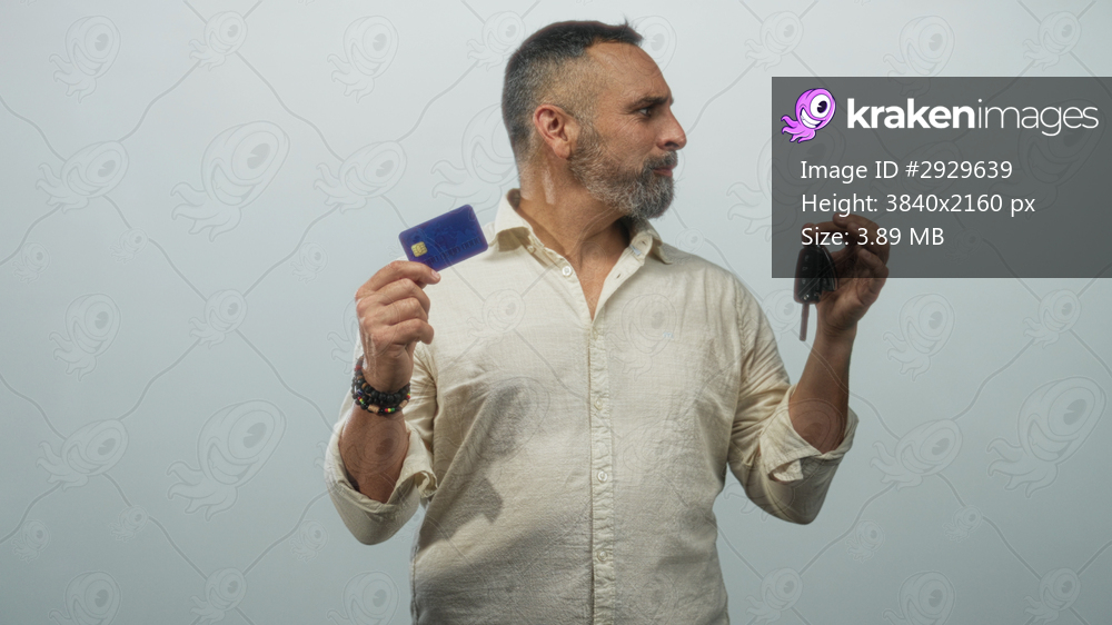 Man holding a creditcard and car keys in studio, comparing the two items while looking between them; choice doubt.