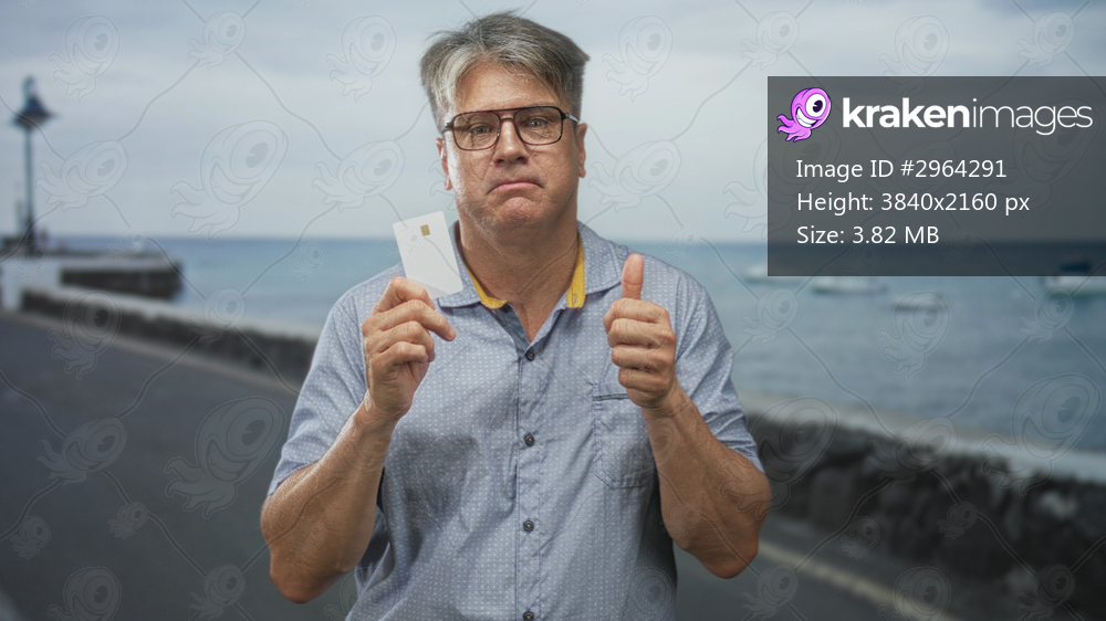 Man holding a creditcard, hands raised in a shrug and giving thumbs up while standing on a seaside street with pier, lamppost and boats visible; confidence. - Kraken Images