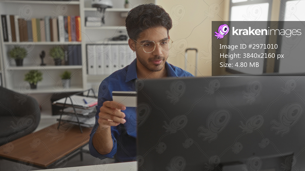 Man holding a creditcard while reaching toward a computer monitor and typing with one hand in a building; focused productivity.