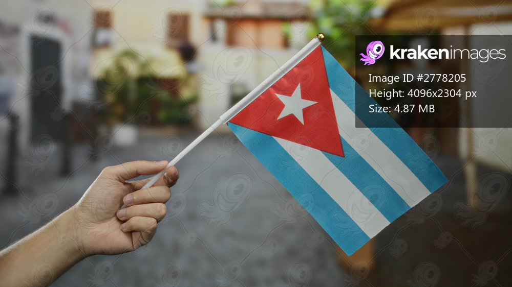 Man holding a cuban flag in an outdoor city street scene, showcasing national pride and cultural identity with a blurred urban background emphasizing location. - Kraken Images