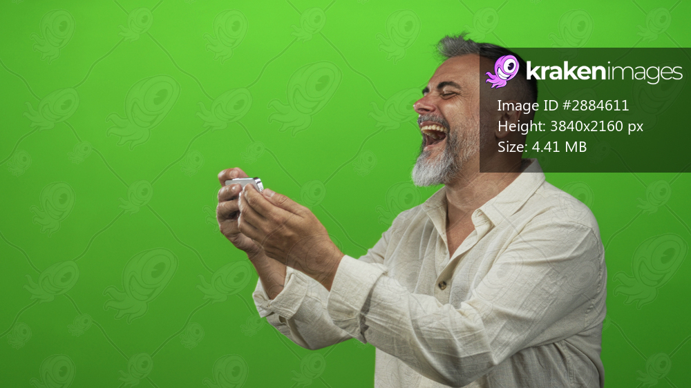 Man holding a device and laughing with open mouth while gesturing with hands in green studio; happiness.