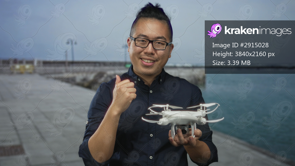 Man holding a drone and giving thumbs up on a street promenade by the sea; hobby technology confidence.