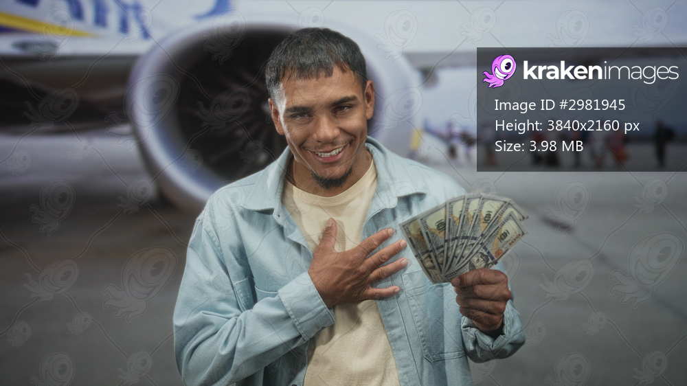 Man holding a fan of dollars with hand on chest at airport by jet engine, smiling and wearing light jacket and t shirt; gratitude success.