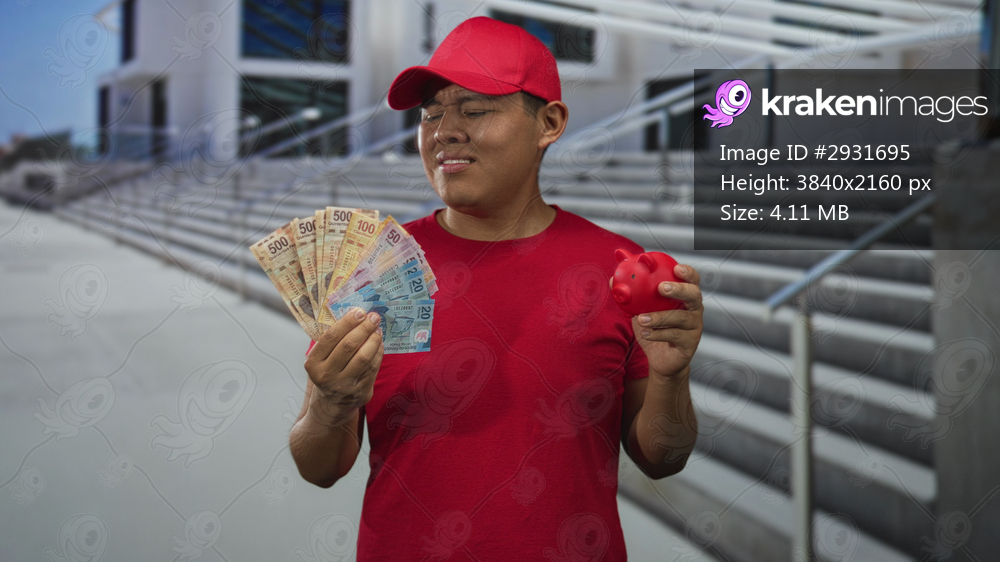 Man holding a fan of mexican pesos with one hand and a red piggybank in the other, wearing a red cap and shirt in front of building steps; financial worry. - Kraken Images