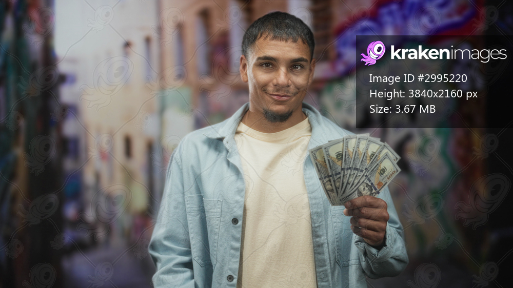 Man holding a fan of us dollars in his hand on a graffiti street, wearing light blue jacket and beige tee while smiling at camera; confidence ambition success. - Kraken Images