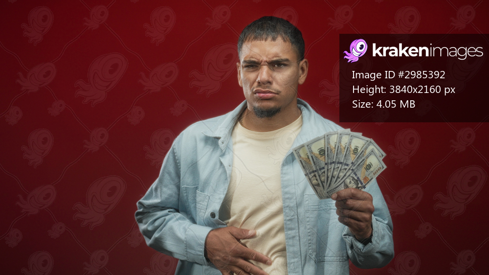 Man holding a fan of us dollars in his right hand while clutching his stomach, wearing a light denim jacket against a red studio backdrop; unease doubt. - Kraken Images