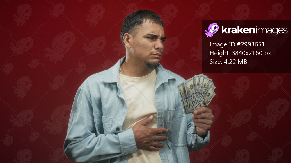 Man holding a fan of us dollars in his right hand while clutching his stomach, wearing a light denim jacket against a red studio backdrop; unease doubt. - Kraken Images