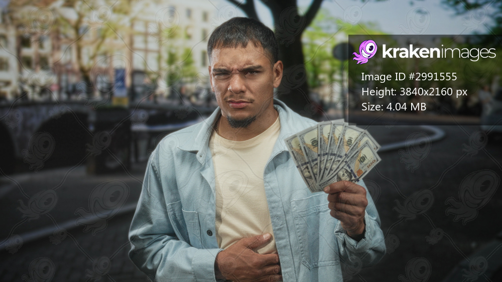 Man holding a fanned stack of dollars with one hand and other hand on stomach on street, squinting in light jacket; confidence ambition.